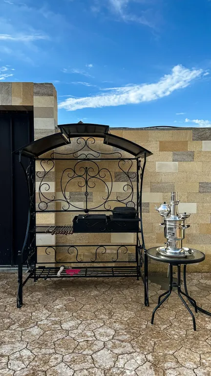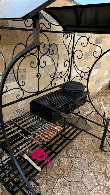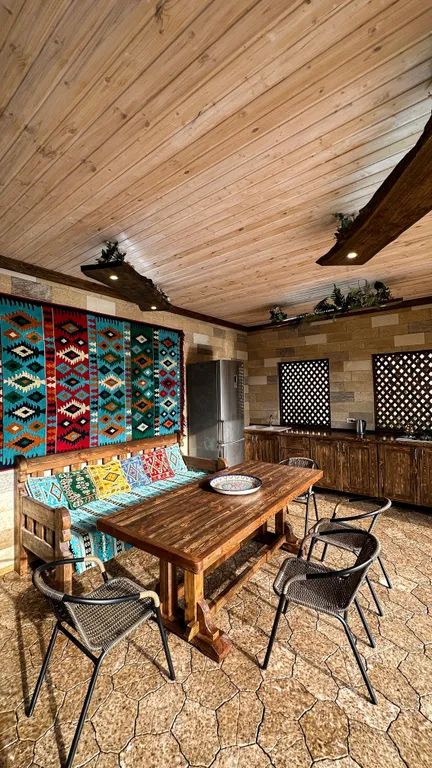 Во дворе отдельная беседка с оборудованной кухней, зоной мангала, ванной комнатой.